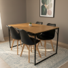 Este conjunto de jantar une elegância, resistência e praticidade. A mesa possui 120 cm de comprimento, 80 cm de largura e 75 cm de altura, com tampo amadeirado que traz um visual aconchegante, combinado com estrutura em aço preto, garantindo durabilidade e estilo industrial contemporâneo.